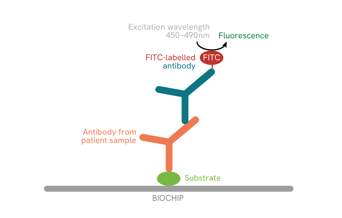 最初のインキュベーションステップで、希釈したサンプルに含まれる特定の抗体が固相結合抗原に結合します。次のステップで、フルオレセイン(FITC)標識抗体(コンジュゲート)がサンプルの特定の抗体に結合します。励起波長により励起された複合体は蛍光を発し、蛍光顕微鏡で可視化されます。この手順は用手法(マニュアル)、半自動、また​​は全自動化が可能です。